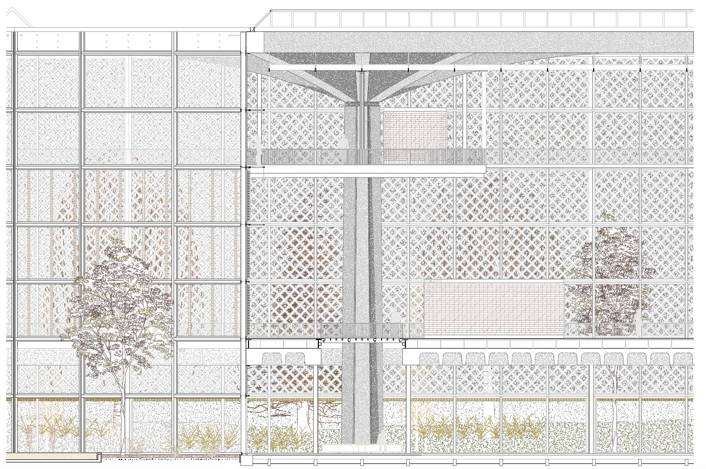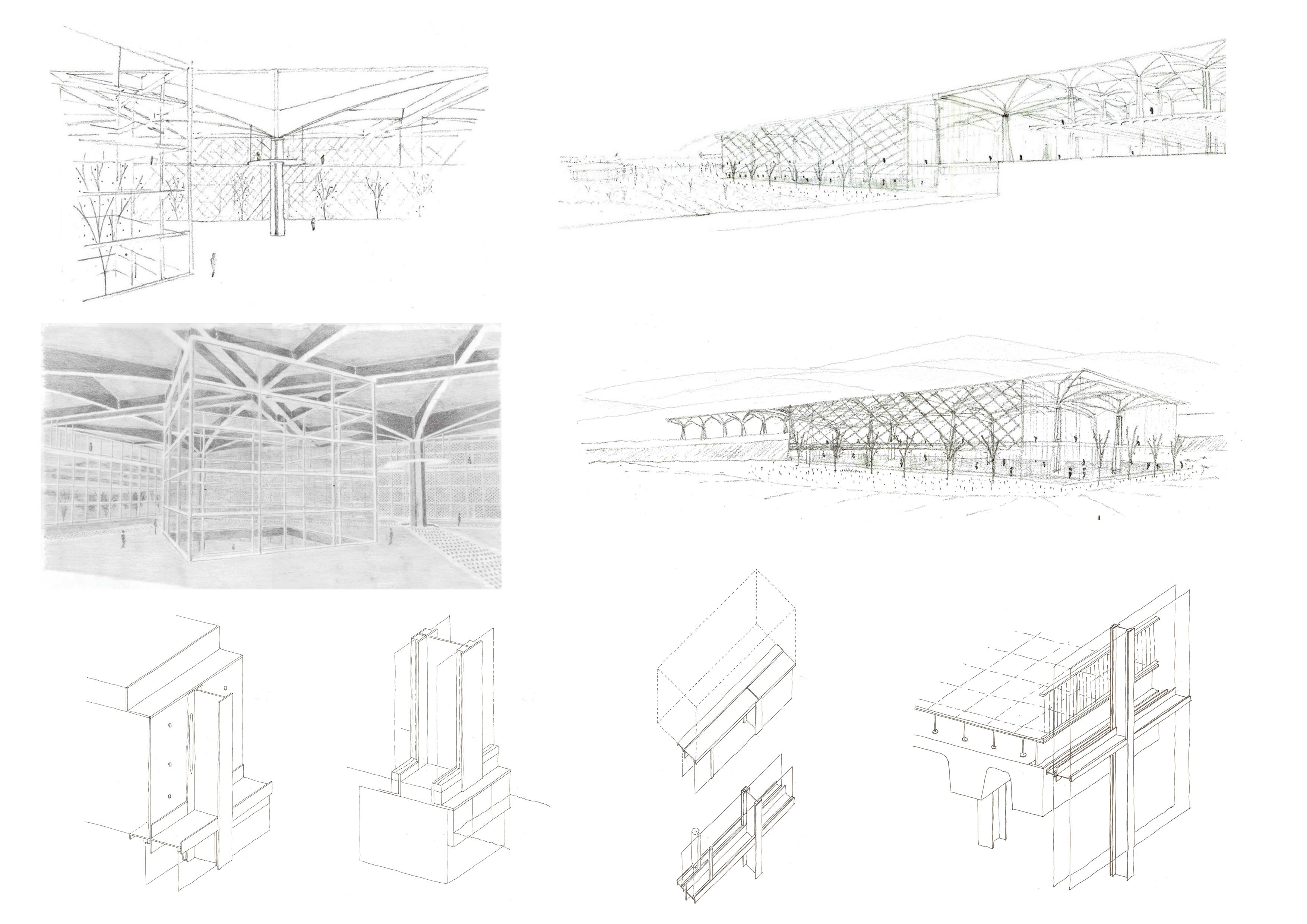 La propuesta para este proyecto se basaba en una estructura modular de paraguas de hormigón. Esto permitía crear los espacios diáfanos necesarios para el tránsito y estancia de las personas. La terminal se divide en tres niveles. El de acceso para las salidas, el nivel inferior para las llegadas, y el tercer nivel son una serie de pasarelas colgadas de la estructura, que comparten el gran espacio de la terminal y que son las zonas de tiendas y cafeterías. Los elementos auxiliares del programa son colocados en módulos de cerámica independientes. La terminal cuenta con un patio que relaciona los tres niveles y los ilumina. Otra idea del proyecto era la permeabilidad y crear un ambiente agradable con la vegetación, lo cual fue posible gracias a los muros cortina de los cerramientos y las celosías cerámicas.