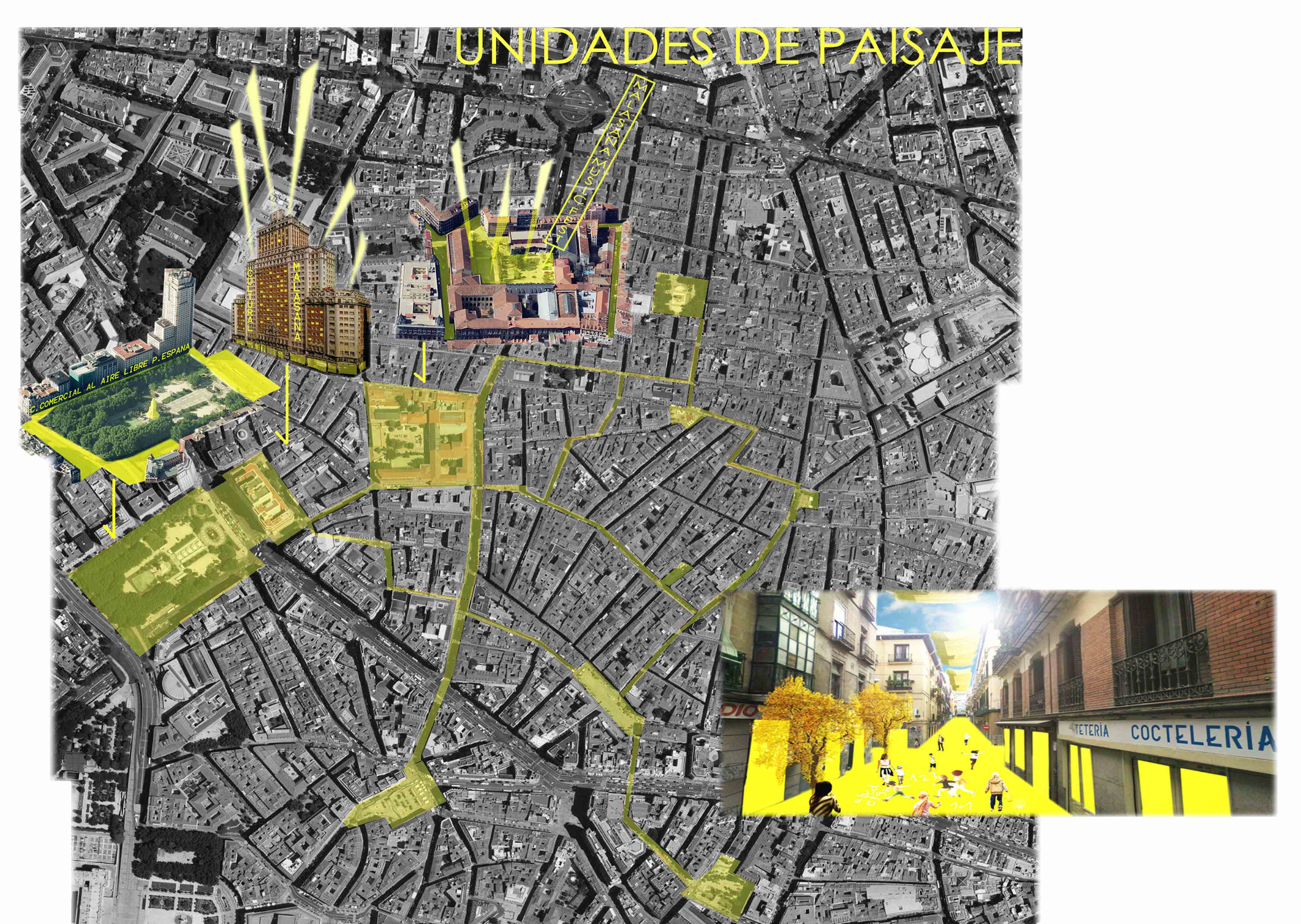 La propuesta consistía en reformar partes degradadas del barrio de Malasaña, Madrid. Para ello estas zonas se conectaron mediante itinerarios que formaban una red. En ellos se incluían diferentes actividades para dinamizarlos. Desde darles un carácter propio, pasando por reforma de edificios singulares, hasta readecuación de plazas o fomento de circuitos de comercio local. La propuesta no sólo actuaba sobre el propio barrio, si no que también cruzaba al otro lado de la Gran Vía para enganchar con las principales plazas del otro lado. Proponiendo también una reforma de la Plaza de España, uno de los espacios públicos más infrautilizados de Madrid, como centro comercial al aire libre.